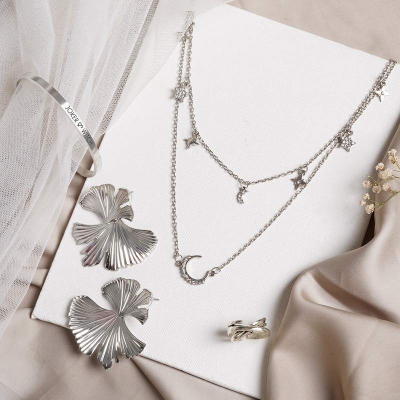 How can you not be obsessed over this combination! This set features a layered necklace paired with floral silver earrings and a dainty shiny silver ring to complete the look.SPECIFICATIONSProduct 1In The Stars Silver Layered NecklaceProduct 2Joker & Witch