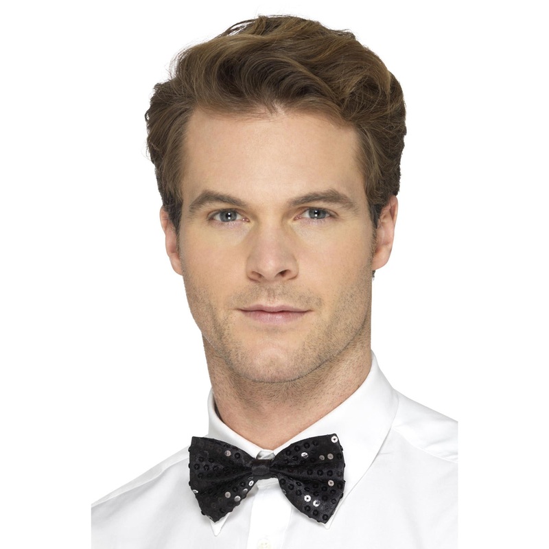 Adults Black Sequin Costume Bow TieIncludes:Bow tieDescription:Black satin costume bow tie.Bow tie features black sequins all over.Classic style bow tie has an adjustable neck strap.Bow tie fastens with a black clasp at the back.Sequin bowtie styling tips: