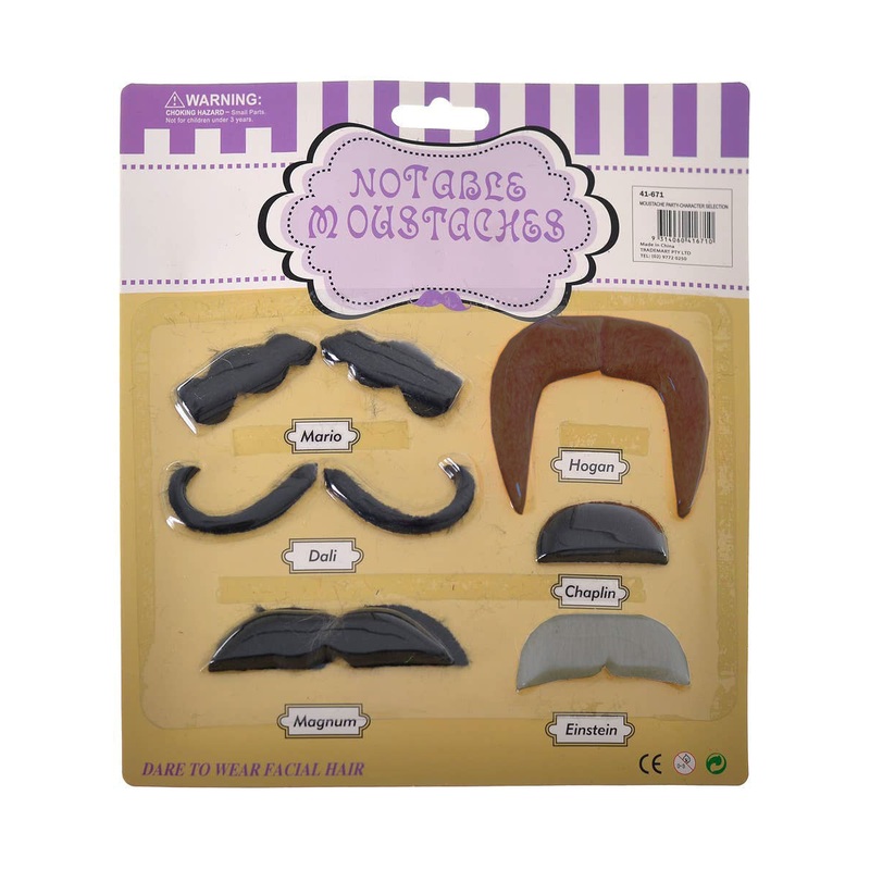 6 Pack of Stick On Fake MoustachesIf you're heading to a party where moustaches are a must then grab this 6 pack of stick on moustaches and you'll be ready. This set of 6 novelty moustaches include iconic character moustaches like Mario, Charlie Chaplin, H