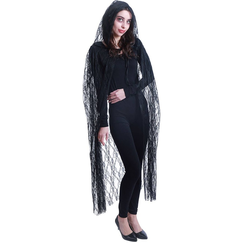 Black Floral Lace Hooded Costume CapeDescription:Black costume cape is made with sheer floral lace.Lace cape features hood and black ties to fasten on the neck.Cape is approximately 122cm in length from shoulder to hem.One size fits most.