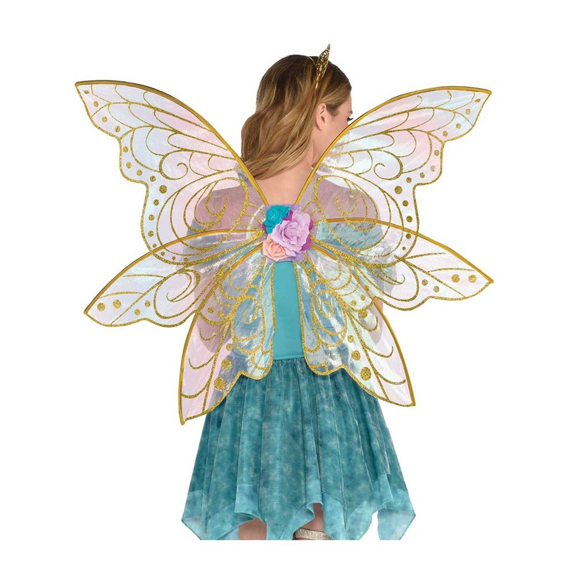 Large Iridescent Fairy Wings with Gold Glitter Details and FlowersTransform into a mythical fairy with this stunningly beautiful pair of iridescent fairy wings! The perfect magical addition to your fairy costume these costume accessory is guaranteed to imp