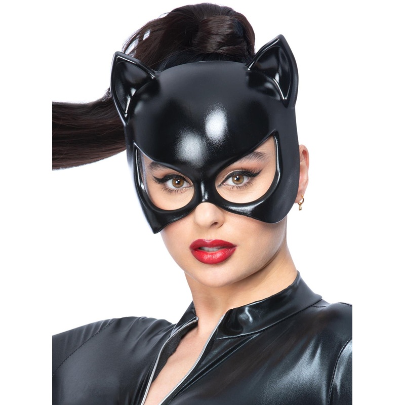 Womens Shiny Black Cat Costume MaskIncludes:MaskDescription:Costume mask is made with black moulded plastic.The half face cat style mask is designed to cover the forehead down to the base of the nose tip.Mask has pointy cat ears attached at the top.Cat mas
