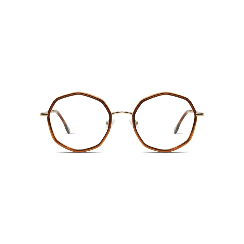 Always has 2 colored fronts and 2 acetate fronts. 2 classical colors and 2 contrasting colors. Always combined with a metal color. Very unique shape, round but angled like an octogon. Interesting take on a round shape.