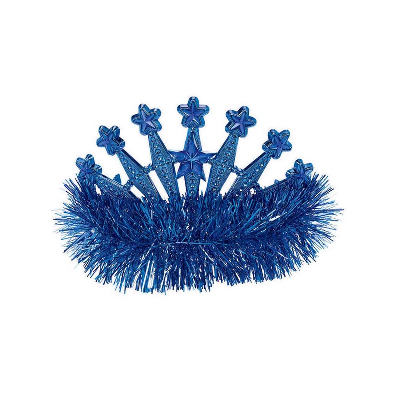 Blue Tinsel Costume TiaraIncludes:TiaraDescription:Blue tiara made from hard moulded plastic.Tiara features seven blue plastic gemstone stars along the top, and one large plastic gemstone star in the centre.Costume tiara also features blue tinsel along the
