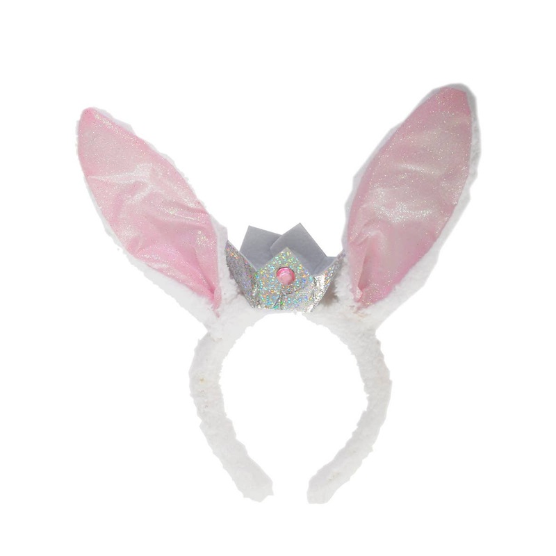 Pink and White Bunny Ears with CrownDescription:Plastic headband base with a soft white faux fur finish.Matching fake fur ears with pastel pink glitter details.Bendable wire to customise shape and maintain height..Holographic silver felt fabric crown with