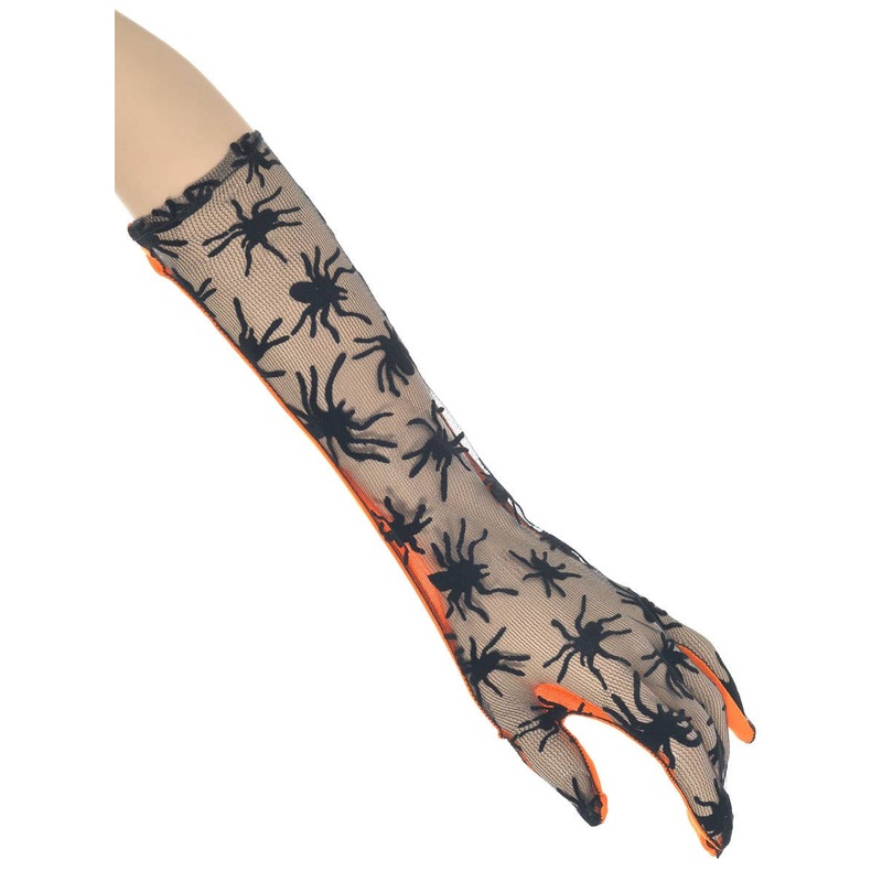 Orange Halloween Mesh Spider Costume GlovesDescription:Gloves measure approximately 40cm in length and approximately 10cm in width.These gloves are made from delicate black lace material on the front and orange stretch polyester on the back.Gloves feature
