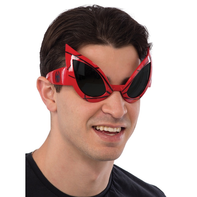 Adults Red Spiderman Costume GlassesIncludes:GlassesDescription:Glasses are made from red plastic and feature a black spider on the arms.Frames around the lenses are oval with points and black spiderweb print.Lenses are tinted black.This is an officially l