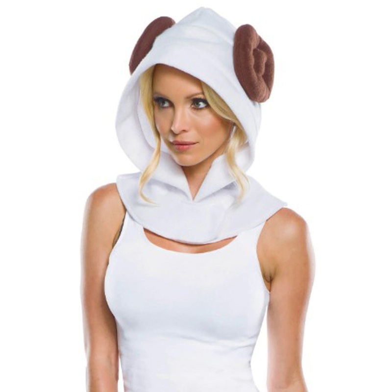 Womens Princess Leia Star Wars HoodIncludes:HoodPlease note: singlet is not included.Description:Hood is made from white fabric and has an attached collar.Attached to the sides are Princess Leis trademark buns made from brown felt.Hood has a velcro closure