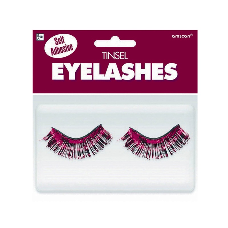 Burgundy Tinsel False EyelashesIncludes:EyelashesDescription:Each eyelash measures approximately 2.5 cm.The eyelashes have blunt ends and are made from burgundy tinsel.Eyelashes have self adhesive backing.Tinsel eyelash styling tips:This burgundy false eye
