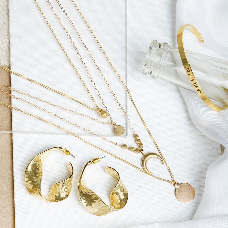 A set that will give you all the reasons to dress up this season! This set features a layered necklace paired with statement earrings and a shiny mantra band. Be bold and stand out with this set!SPECIFICATIONSProduct 1Aurora Layered Gold NecklaceProduct 2L