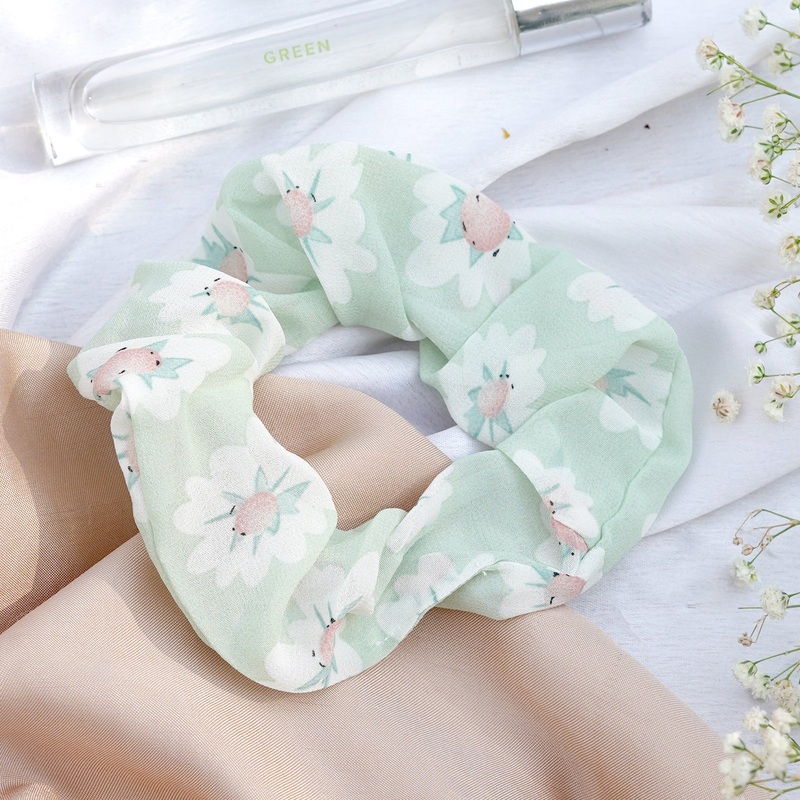 _Like basically every other gigantic trend from the ’90s, scrunchies have come back in full force. Our Sunshine Chiffon Green Scrunchie with pretty summer florals provides you best chance to shine even on your normal days. We love the idea of stacking them on wrist with watch or bracelets.