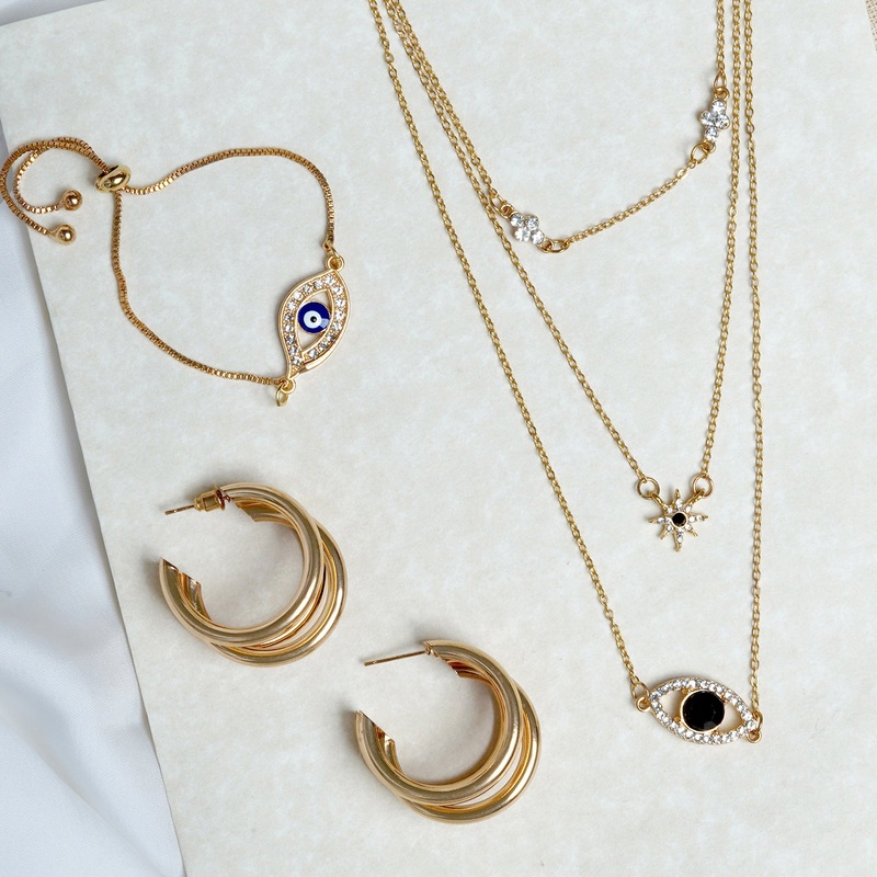 When vibes speak louder than words, Nothing can dull your day! Add the right amount of pretty to your look with this cool jewelry set. We assure you only " Good Vibes " when wearing this set! SPECIFICATIONSProduct 1 Kaylee Evil Eye Layered NecklaceProduct