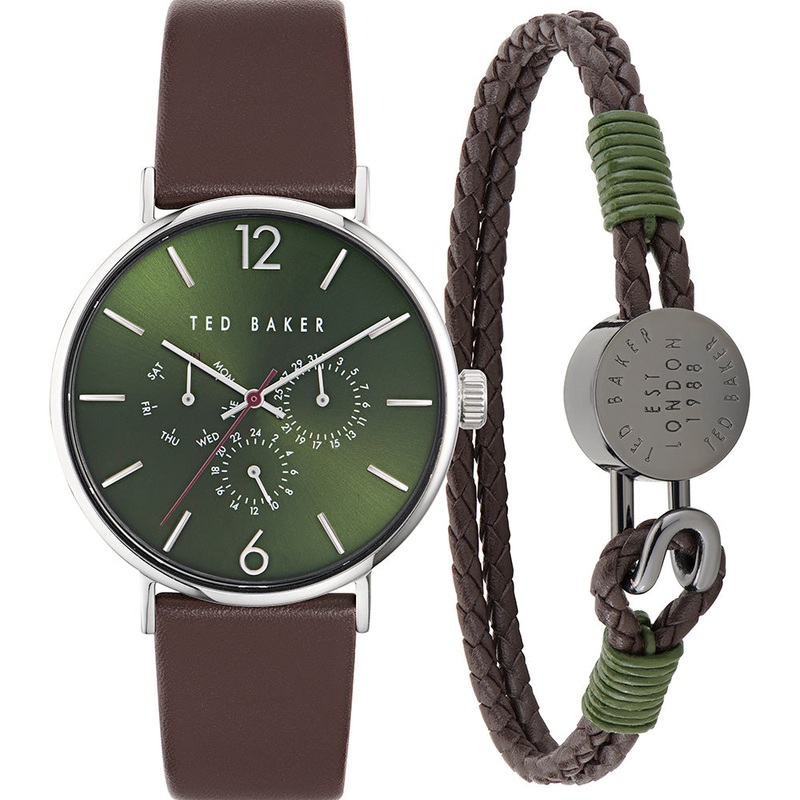 The Ted Baker BKGFW2306 Phylipa Watch Set combines classic elegance with modern versatility. The watch features a sleek silver stainless steel case and a striking green dial, paired with a rich brown leather strap. Its 41mm case size provides a refined yet