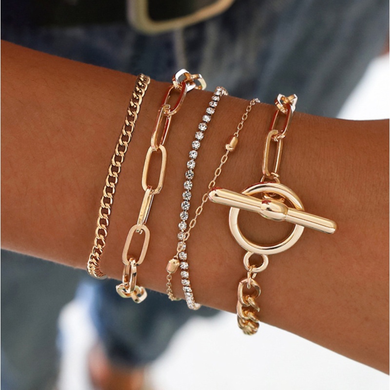 Embellished with crystals and chic chain-link bracelets, sparkling like the night sky, our Toggle Gold Chain Set of 5 Bracelets is a unique find. Just put them on and get ready to fetch some compliments.SPECIFICATIONSColourGoldMaterialMetal AlloyClosureLob