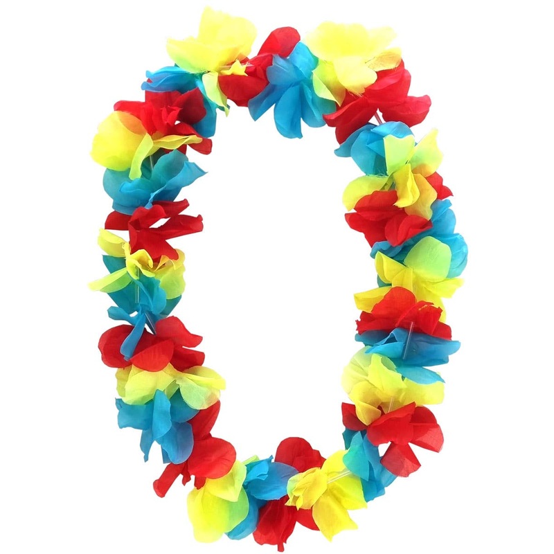 Colourful Flower Costume Accessory LeiDescription:Costume lei is made from a yellow, blue and red polyester material.Fabric flowers are separated by thin clear tubes in between all the way throughoutHawaiian lei measures approximately 55cm in length.