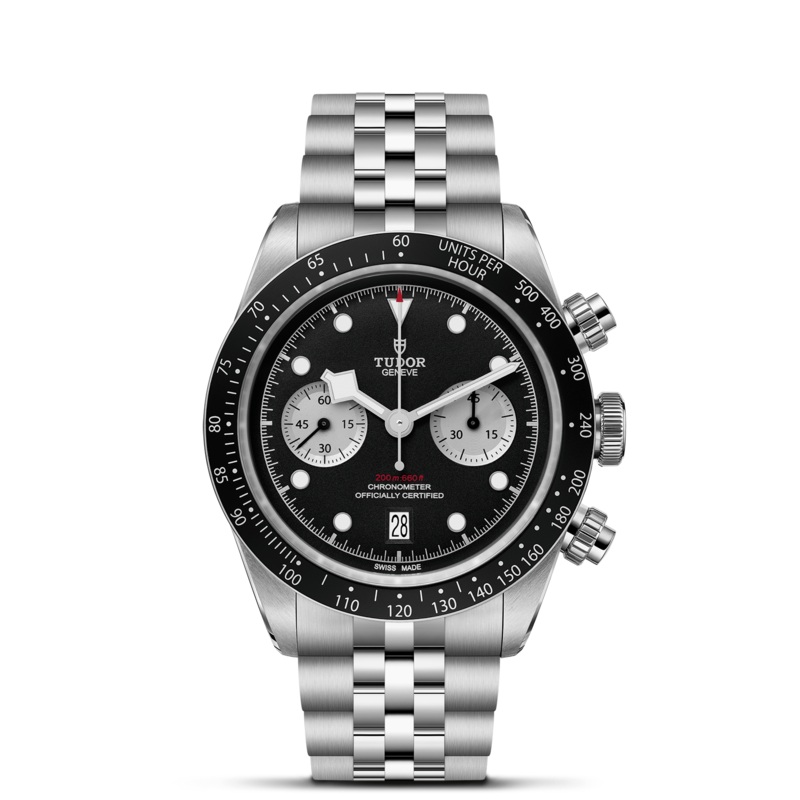 41-mm steel case, steel braceletCase: 41mm stainless steel case with polished and satin-brushed finishes, Lugs: 22mm lug width, Case thickness: 14.4mmBezel: Fixed stainless steel bezel with matt black anodised aluminium disc with tachymetric scale and silv