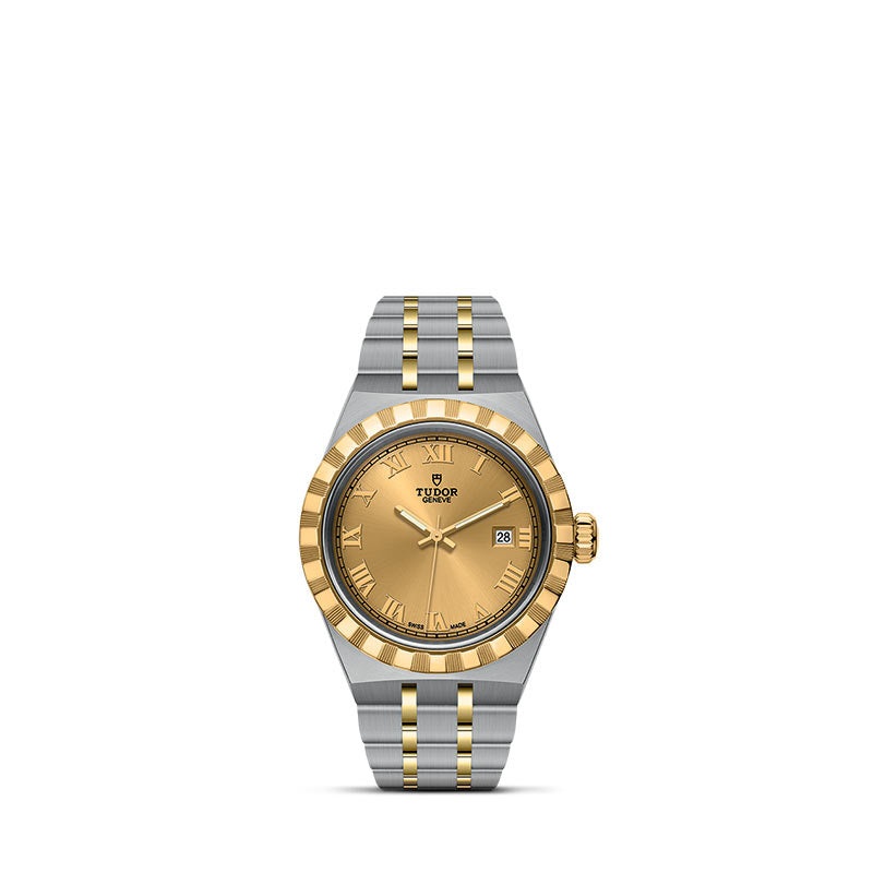 28mm steel case with polished and satin finishChampagne-colordialDate at 3 oclockWaterproof to 100m (330 ft)Notched bezel in yellow gold, alternating cut grooves and polished finishSapphire crystalSelf-winding mechanical movement, Calibre T201Power reserve