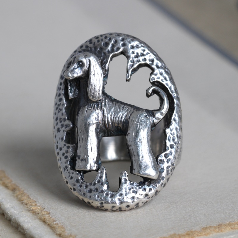 Crafted in heavy solid sterling silver, this circa 1960 statement ring features a large-scale 3-D portrait of an Afghan Hound in a brutalist-style frame. It’s quirky and completely wonderful: the handsome canine face is rendered charming with a pert expression and slight tilt of the head.