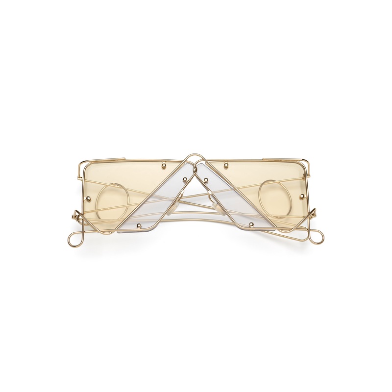 Gabrielle’s ephemeral collection celebrates childhood pursuits as rites of passage, highlighting the imaginative ways we entertain ourselves, like turning a string into a cat’s cradle or folding paper airplanes. Her sunglasses design is inspired by Beatnik artist Harry Smith’s String Figure archive, a universal game of loops and knots that serves as a hand dance, learning tool, and storyteller. Fascinated by the endless variations a continuous piece of string offers, Gabrielle aims to merge facial features with overlapping wires to create facial jewelry.